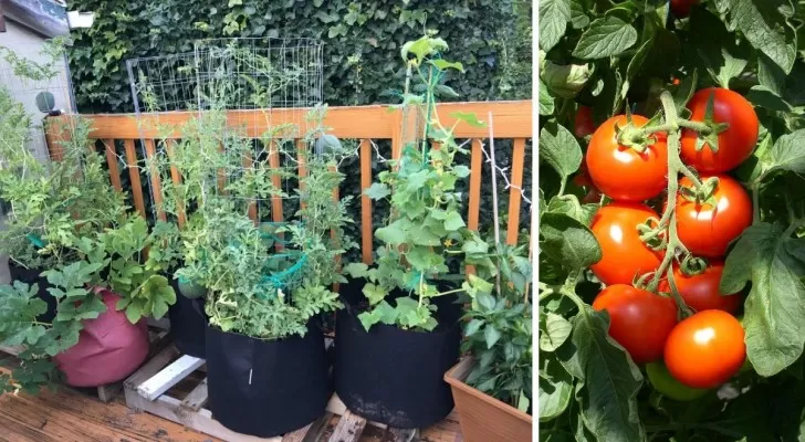 Coltivazione di pomodori: scegliere varietà determinate per una crescita compatta. Un pomodoro per secchio, con supporto per piante. Sono essenziali annaffiature costanti e fertilizzazioni regolari.