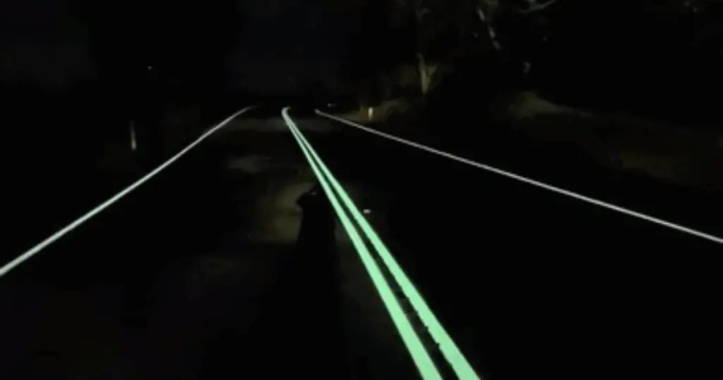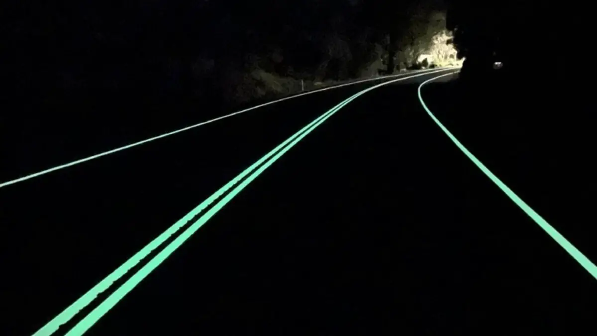 Ad esempio, un bordo di corsia verniciato con pigmenti fotoluminescenti si carica alla luce solare e resta visibile anche in ombra o controluce.
