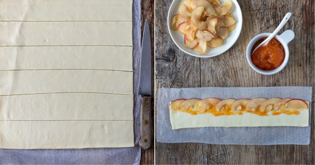 Srotola il primo rettangolo di pasta sfoglia, mantenendo la carta forno. Spalma la confettura di albicocche in modo uniforme, poi distribuisci sopra le mele cotte e spolverizza con la cannella. Copri con il secondo rotolo di sfoglia e premi leggermente con le mani per far aderire i due strati, sigillando i bordi.